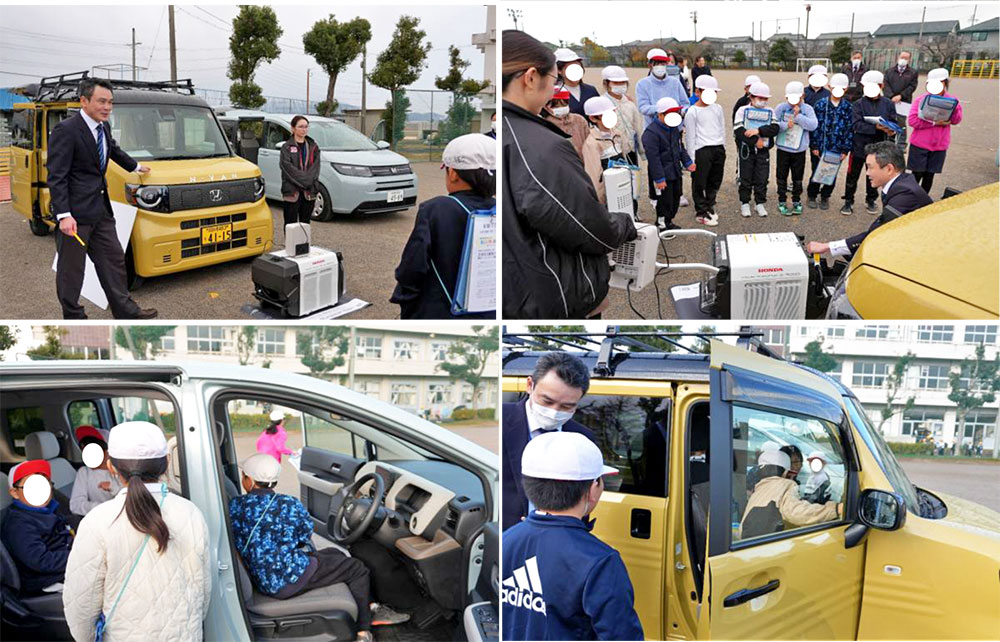授業の後半は校庭に移動し、電気自動車の体感会を実施。実際に車に触れ、外部給電器を使ってヒーターが点灯する様子を目にした子どもたちからは、驚きと歓声が上がりました。