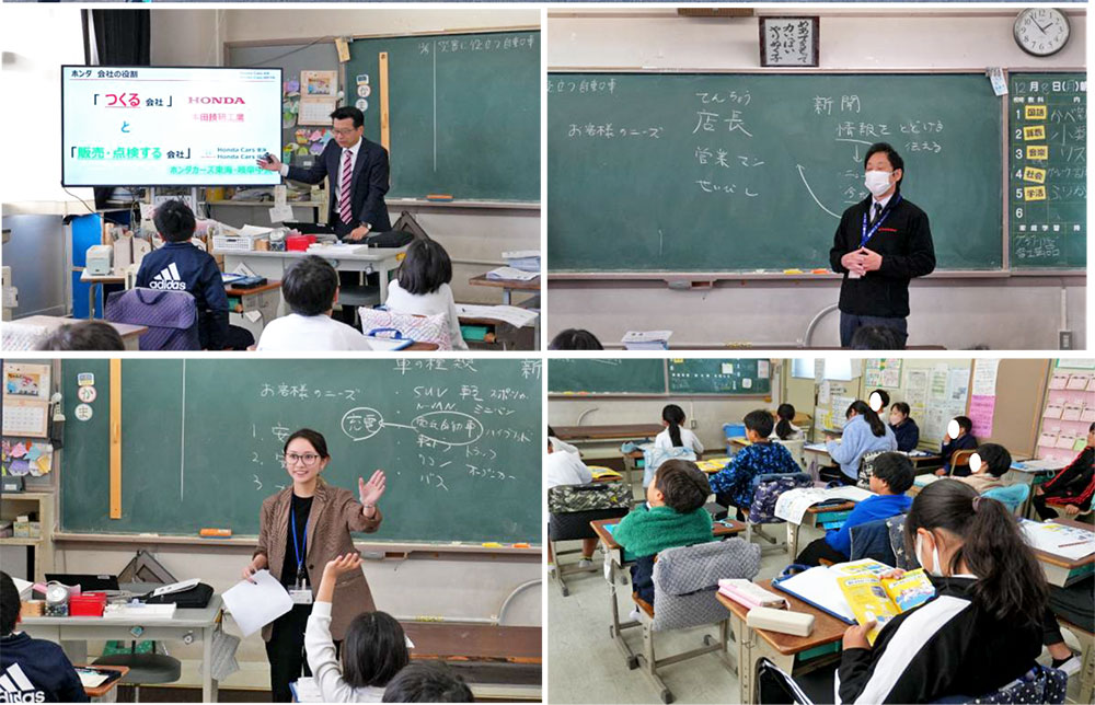 続いて、自動車が社会の中でどのような役割を担っているのかを紹介しました。製造後も、販売、点検、整備といった多くの仕事を通じて、人々の安全で快適な暮らしが支えられていることを、身近な例を交えながら伝えました。