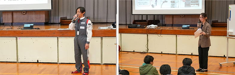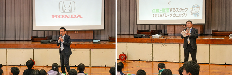 続いて、自動車が工場で製造された後、どのように社会の中で役割を果たしているのかを紹介しました。当日は、実際に販売を担当するスタッフや点検・整備を行うスタッフが登壇し、仕事の内容を分かりやすく説明。質疑応答では多くの質問が寄せられ、子どもたちの高い関心がうかがえました。