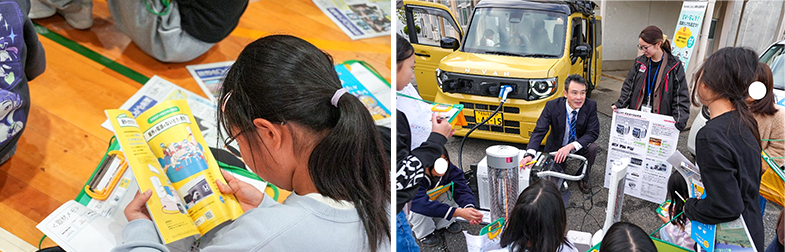 また、環境への取り組みとして電気自動車(EV)を取り上げ、走行中に二酸化炭素を排出しない特長や、災害時に電力として活用できる点について紹介しました。