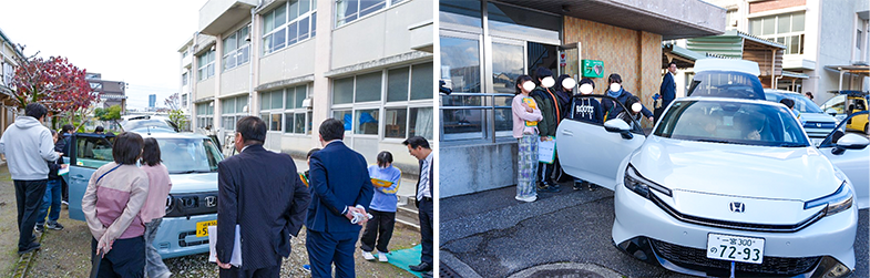 授業の後半は校庭に移動し、体感会を実施。合計6台の自動車に実際に触れたり、外部給電器を使ってヒーターが点灯する様子を確認したりと、体験を通じて理解を深めました。赤く灯るヒーターを囲み、子どもたちからは大きな歓声が上がりました。