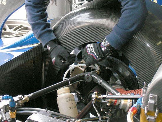 ところがこの予選2回目、終盤で高橋選手から加藤選手に交代し、SLに挑む直前の、マシン確認を行った。しかしこの交代直前なんと他のマシンと接触!見た目には大きなタダメージは無さそうだが、加藤選手からも違和感があるとの事で緊急ピットイン。フロント右ホイールが当たっており、測定するとアライメントも狂っている。まもなく500の走行時間が始まり、20分間の走行終了5分後には300のSLが開始される。それまでに処置をしなくてはならない。SLが始まったらマシン修理は許されない。
