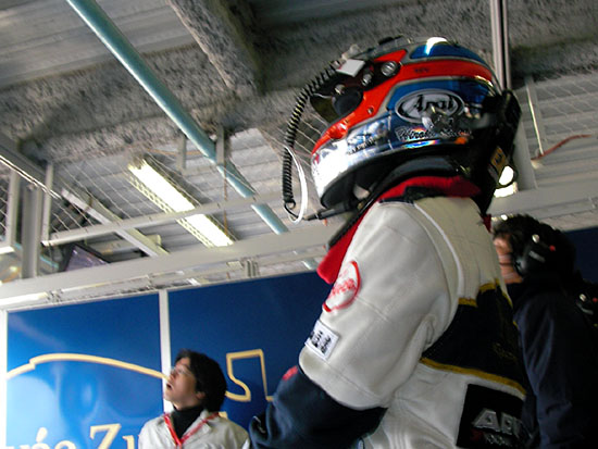 アタッカーは加藤選手。20分間の予選開始から12分。各車のタイムを見てゆっくりコースイン。この時点でのトップ101号車MR-S、既に“やはり”の2秒台。2″923!続いて43号車3″408とやはりミシュラン勢がきた。加藤選手はこの(寒い)季節がら、アウトラップ、そしてもう1ラップと充分タイヤに熱を入れ残り時間6分、アタック開始。